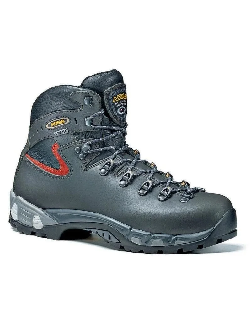 One-piece water-resistant 2,8 mm full grain leather upper. Gore-Tex® lining , waterproof and breathable. Asolo/Vibram® highly technical sole is comprised of three different PU densities that are co-injected and molded together. The high-density front portion secures and guarantees maximum stability. The medium-density heel reduces shock and resulting fatigue during take-off and landing. Further shock absorption is obtained through the four strategically placed low-density cylinders that are linked from the outsole to the midsole. Gripped with a dual density molded rubber outsole produced in conjunction with Vibram®, the balance of the outsole has self-cleaning lugs designed for optimum performance on varying types of terrain. Micro Pulley lacing system.